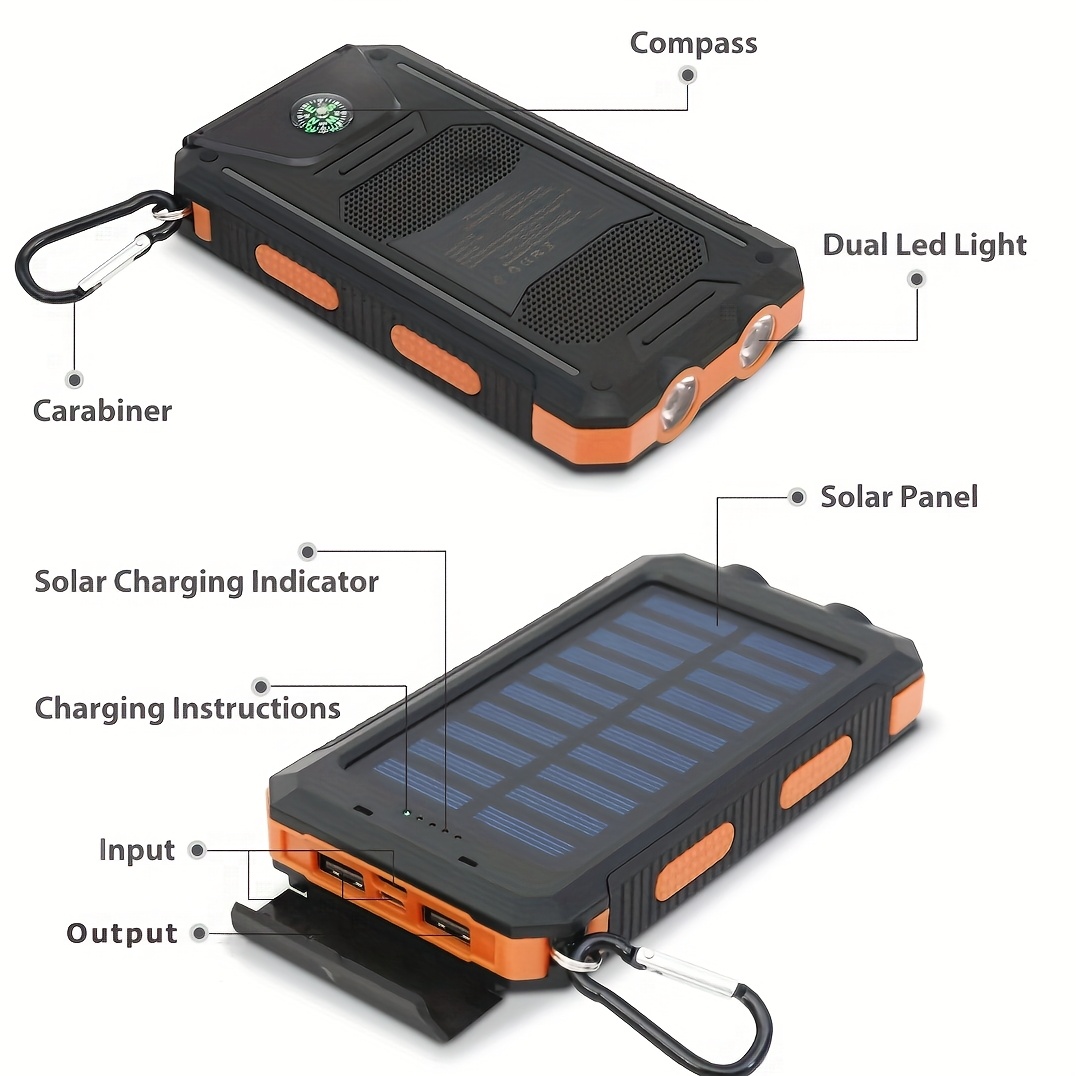 Batería Externa Solar Portátil de 10000mAh con Luz LED Robusta y Dos Puertos de Carga USB, Ideal para Emergencias al Aire Libre.