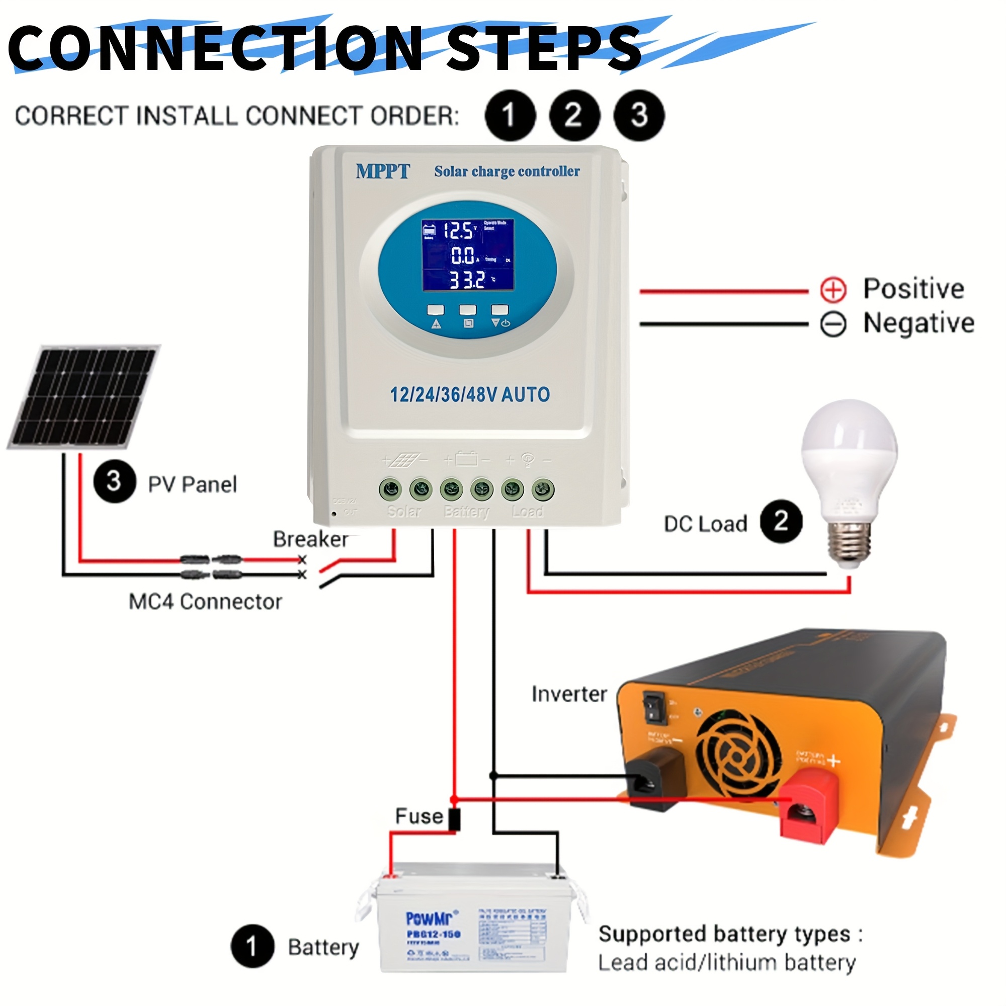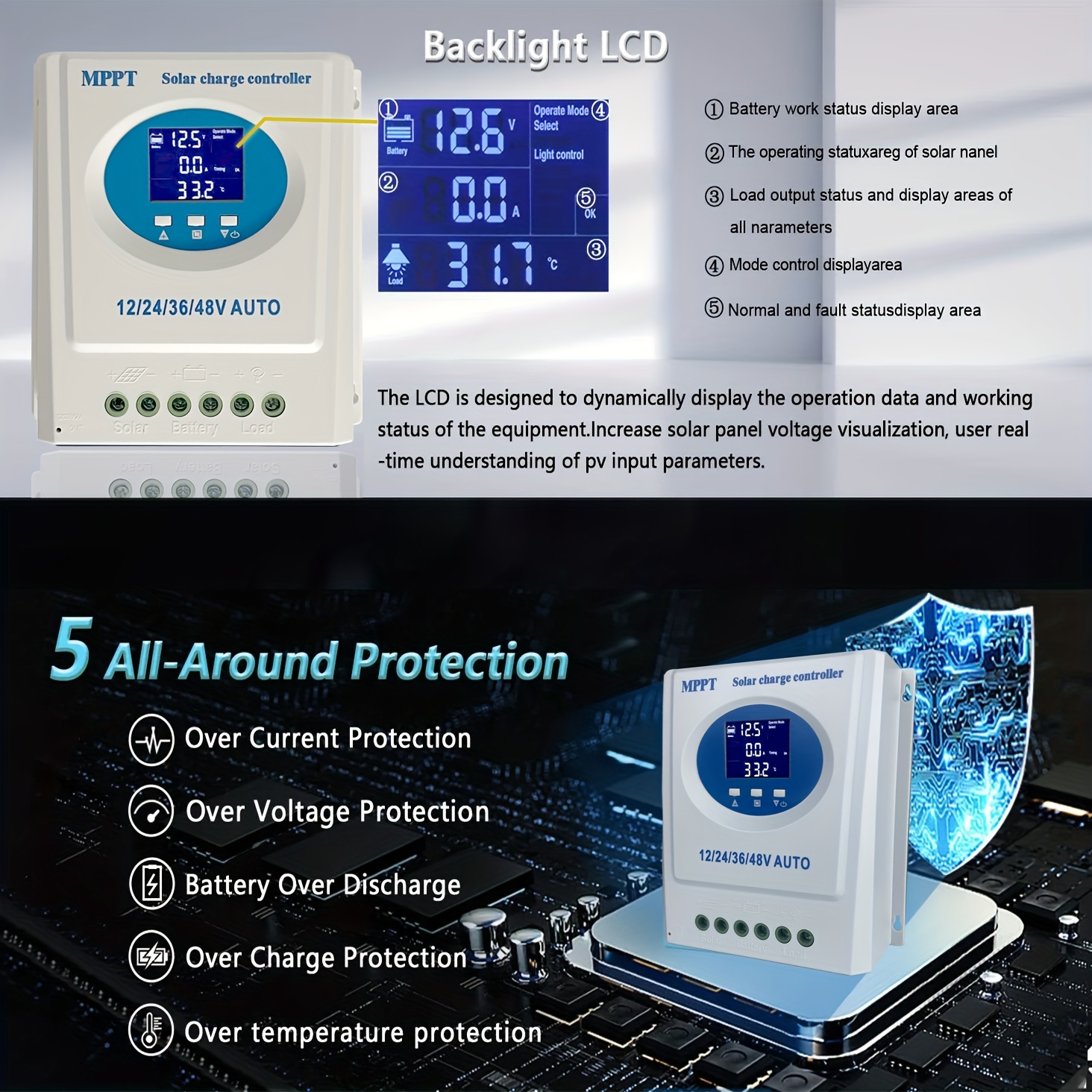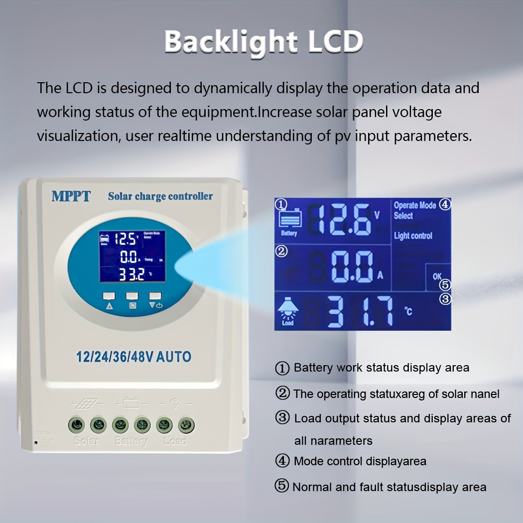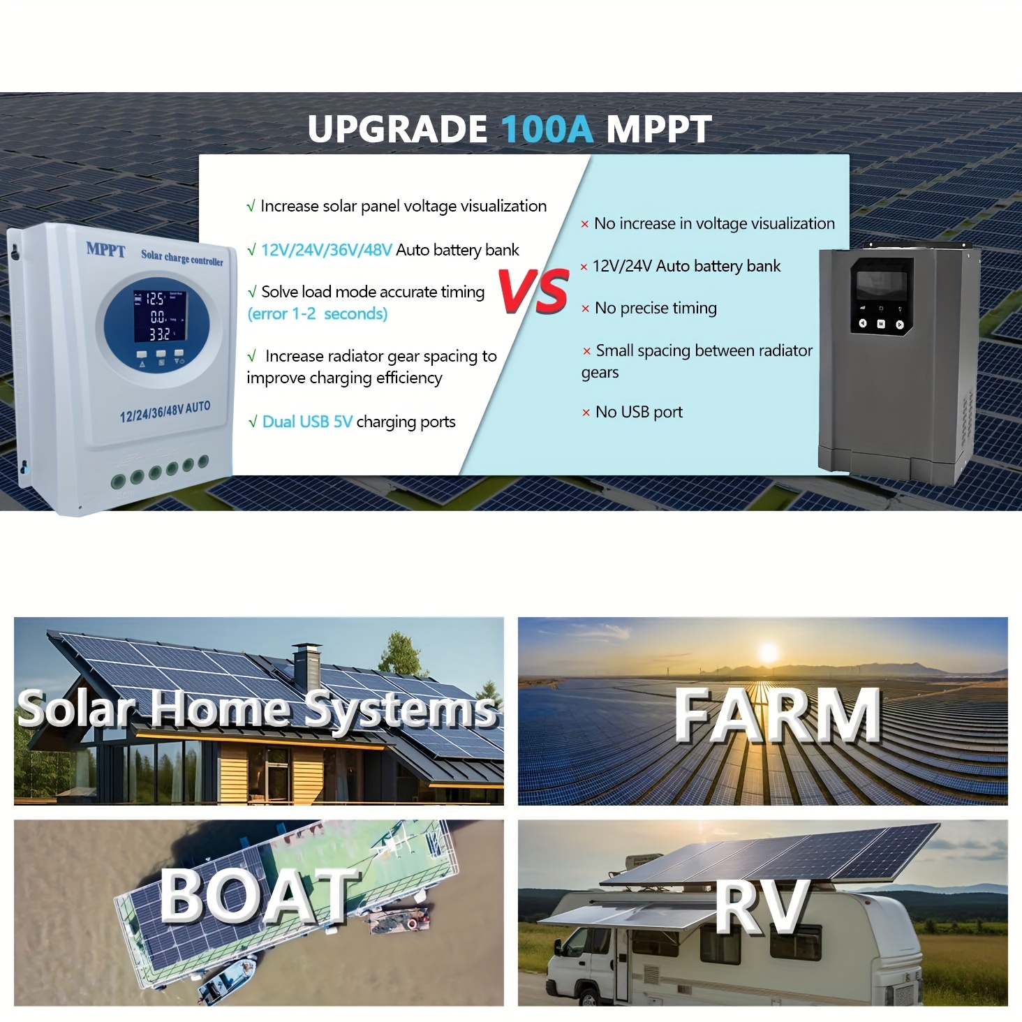 Controlador de Carga Solar MPPT de 120A 60A – Compatible con 12V/24V/36V/48V Automáticamente, con 7 Modos para Baterías de Plomo-Ácido/Lifepo4/Litio, Adecuado para el Hogar, RV o Sistemas Solares Off-Grid, con Puertos USB Duales y un Pantalla LCD