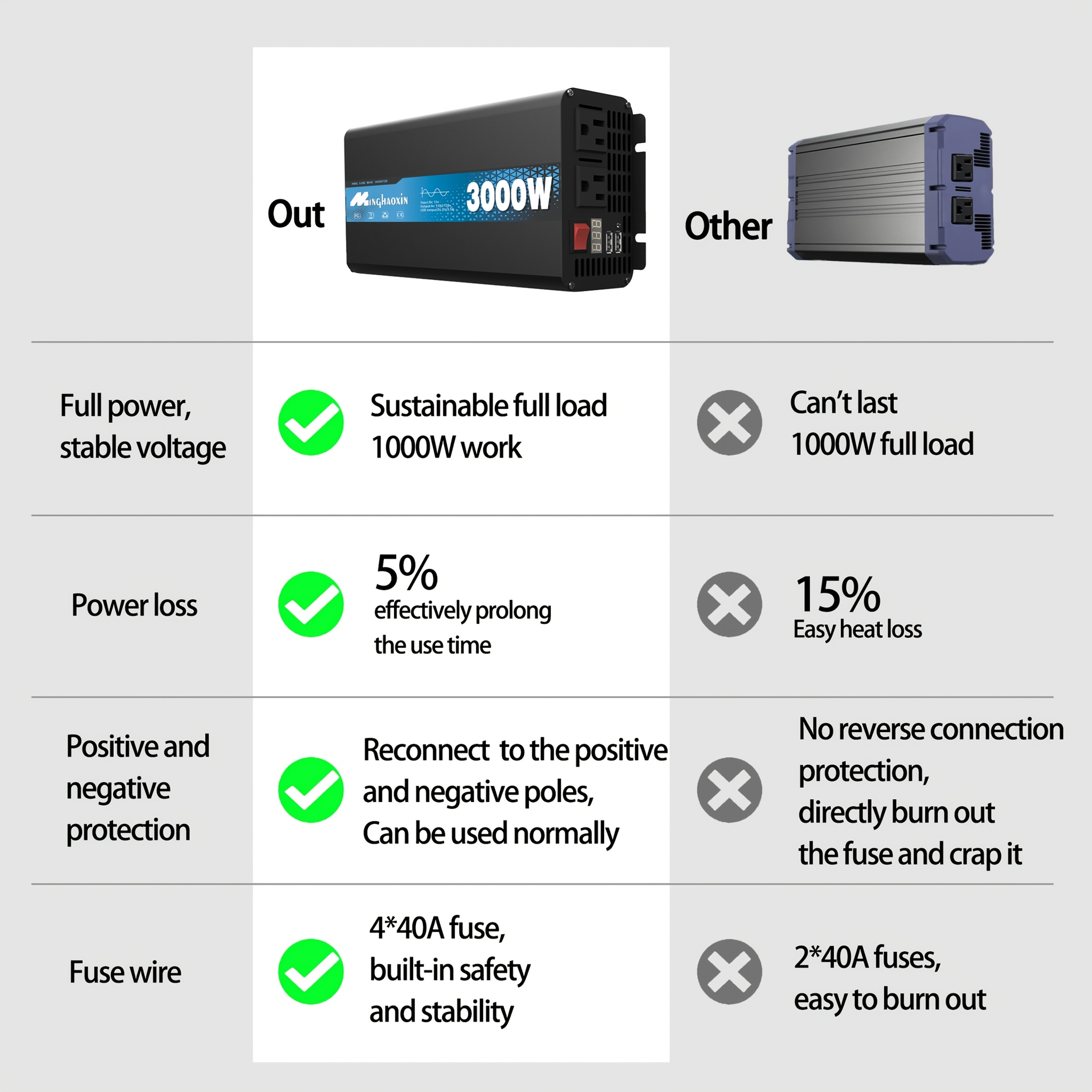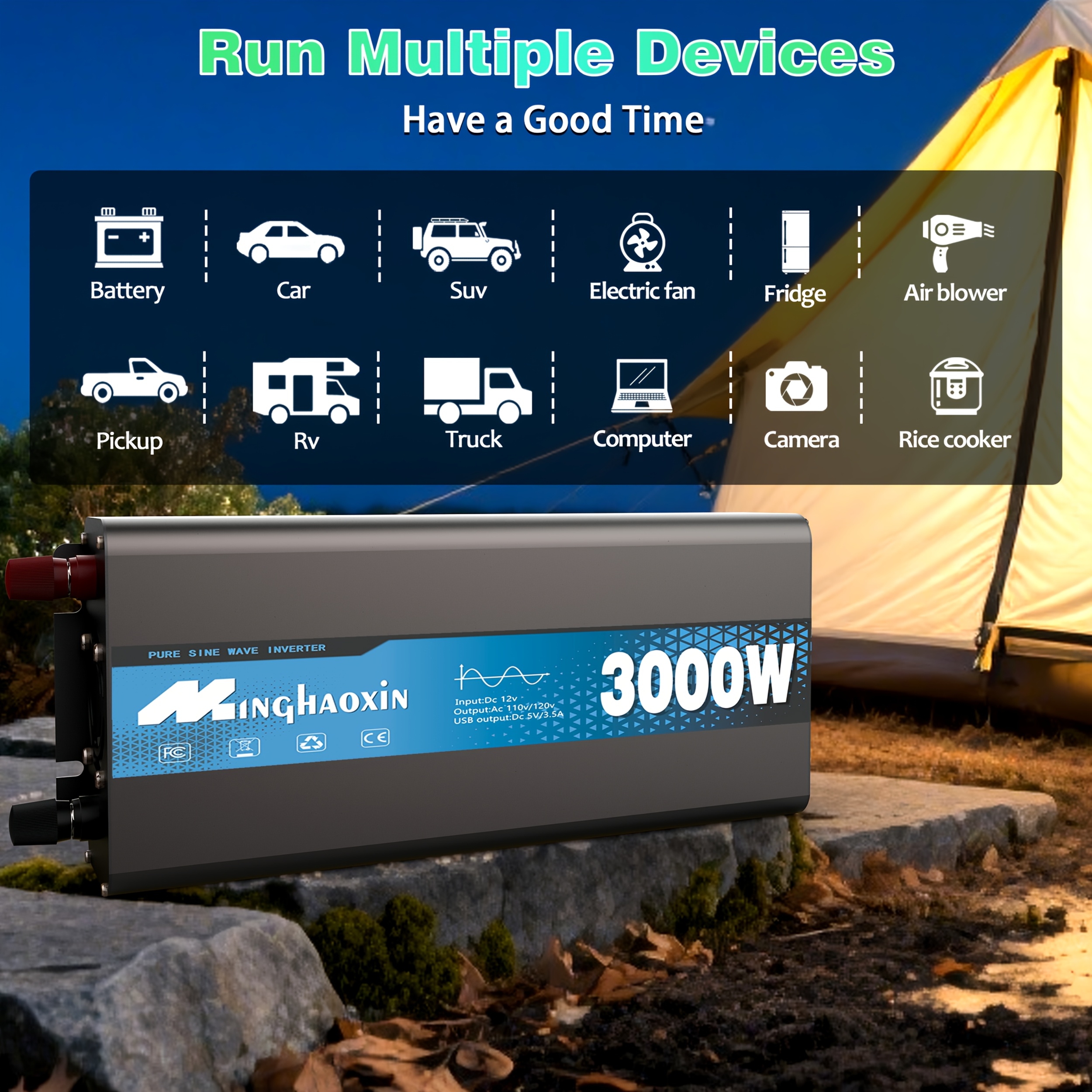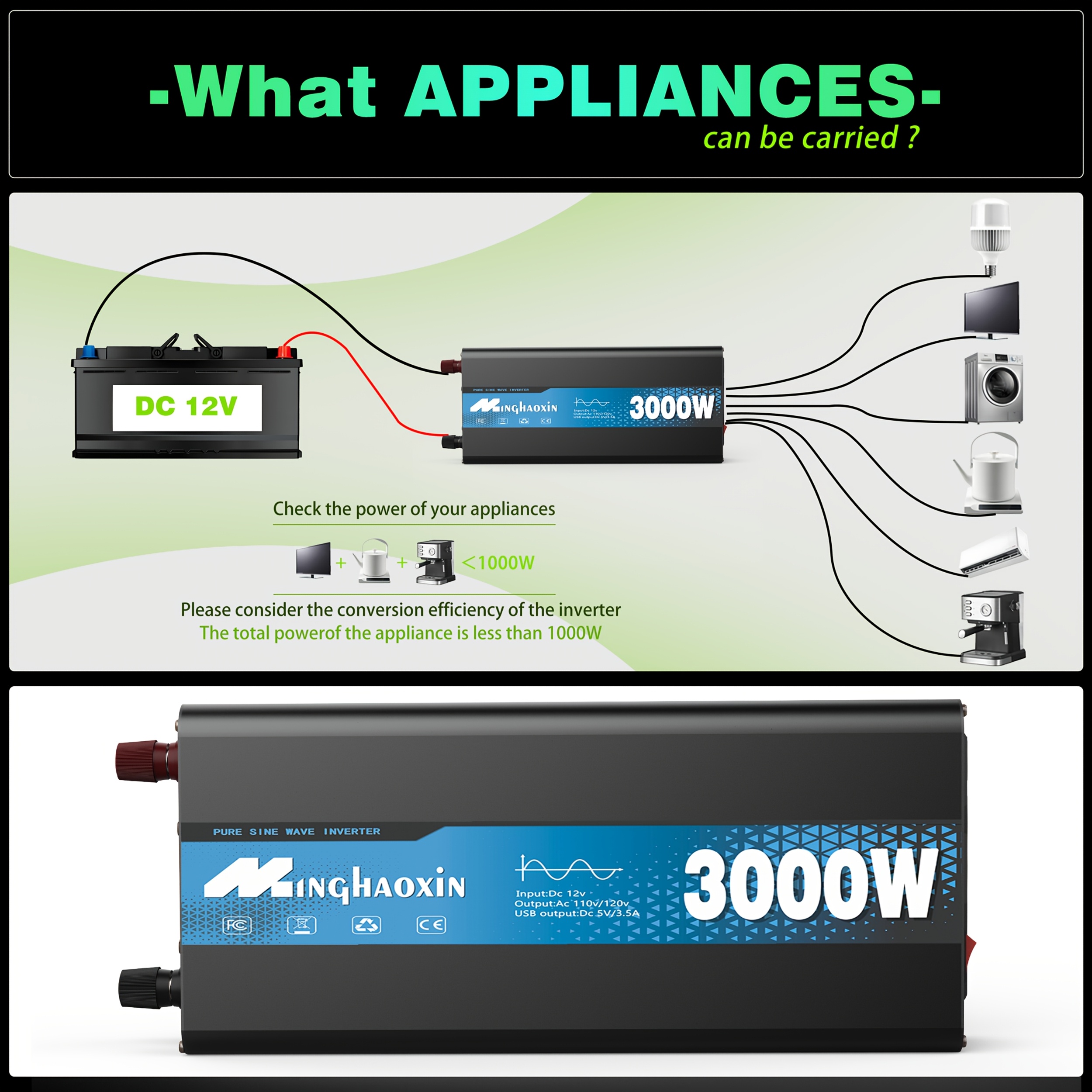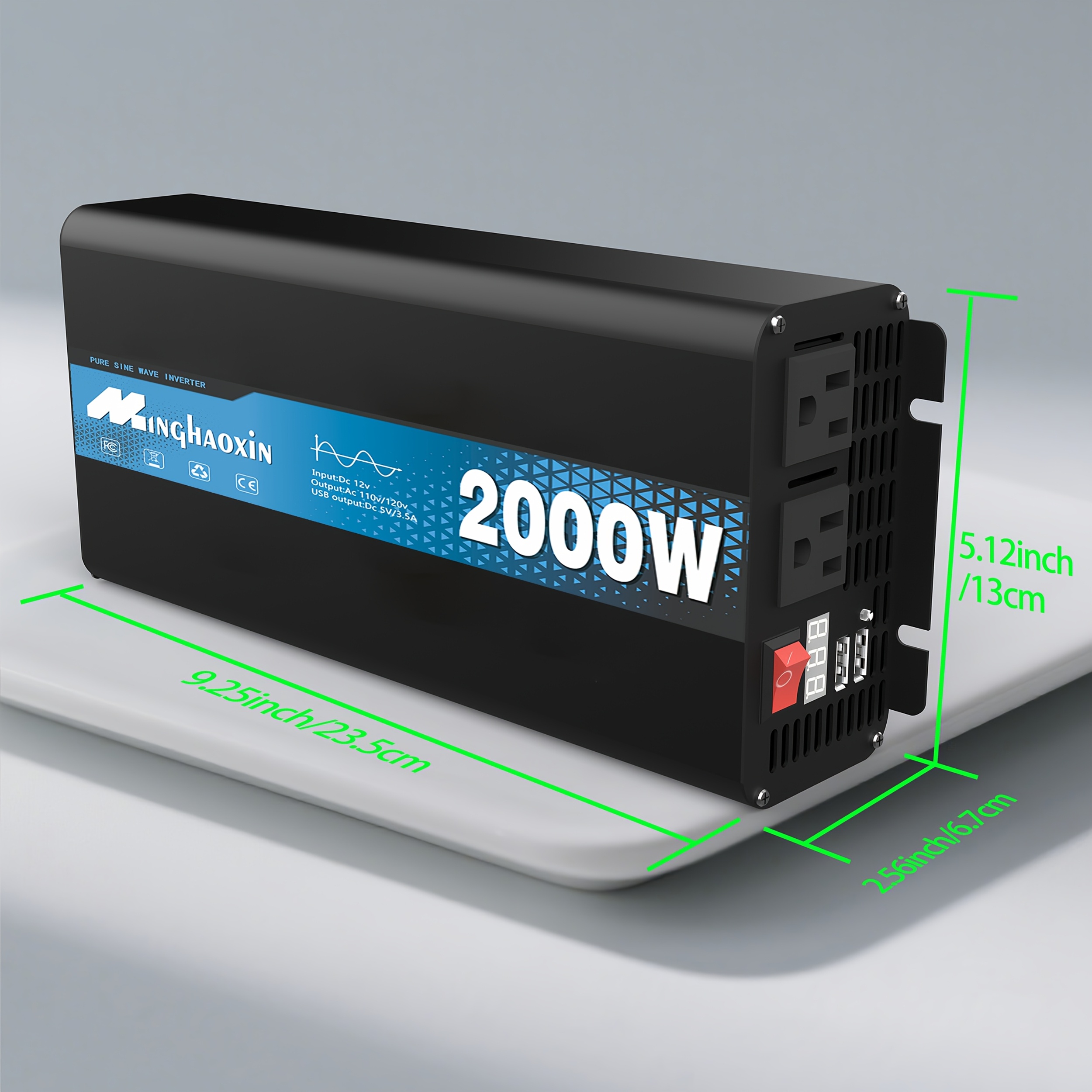 Inversor de onda sinusoidal pura 3000W/2000W/1000W, salida AC de 12V a 110V/120V, carga rápida dual USB, para autos, RVs, barcos, sistemas solares fuera de red, suministro de energía de emergencia para camping, dispositivos médicos CPAP, carga de portátiles con protección contra sobrecarga, enchufe